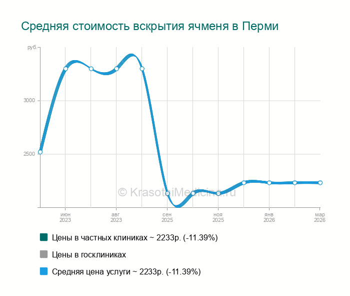 Ячмень — это ограниченное гнойное воспаление тканей века. Чаще всего по мере созревания ячменя происходит его самопроизвольное вскрытие. Хирургическое вскрытие ячменя показано в тех случаях, когда он достигает большого размера, а самопроизвольное вскрытие не происходит. Всего в Перми найдено 11 клиник, где выполняют вскрытие ячменя.
